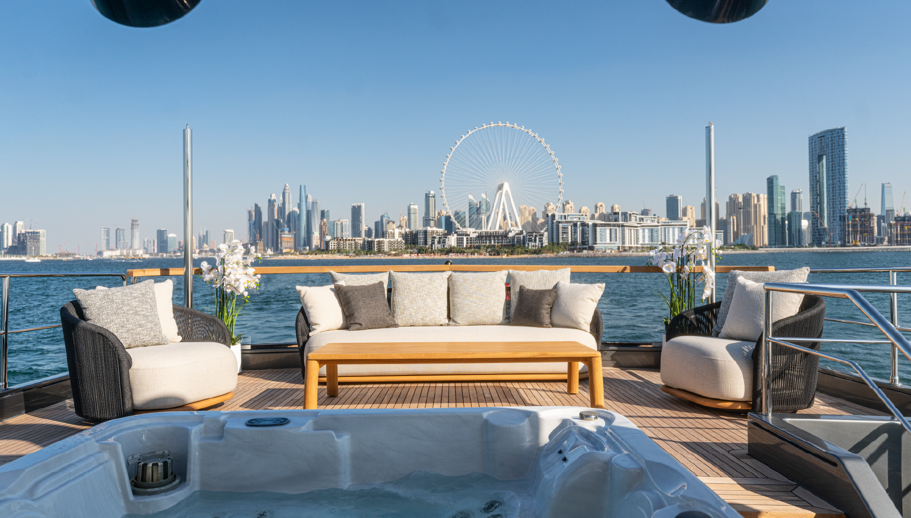 Cruising with powerful, overhauled engines and advanced navigation technology, Spectre delivers a smooth, safe journey. The expansive outdoor decks, complete with elegant lounging and dining areas, are perfect for enjoying the sunshine or the stunning Dubai skyline. This yacht blends luxury, comfort, and performance to create an exceptional charter experience.